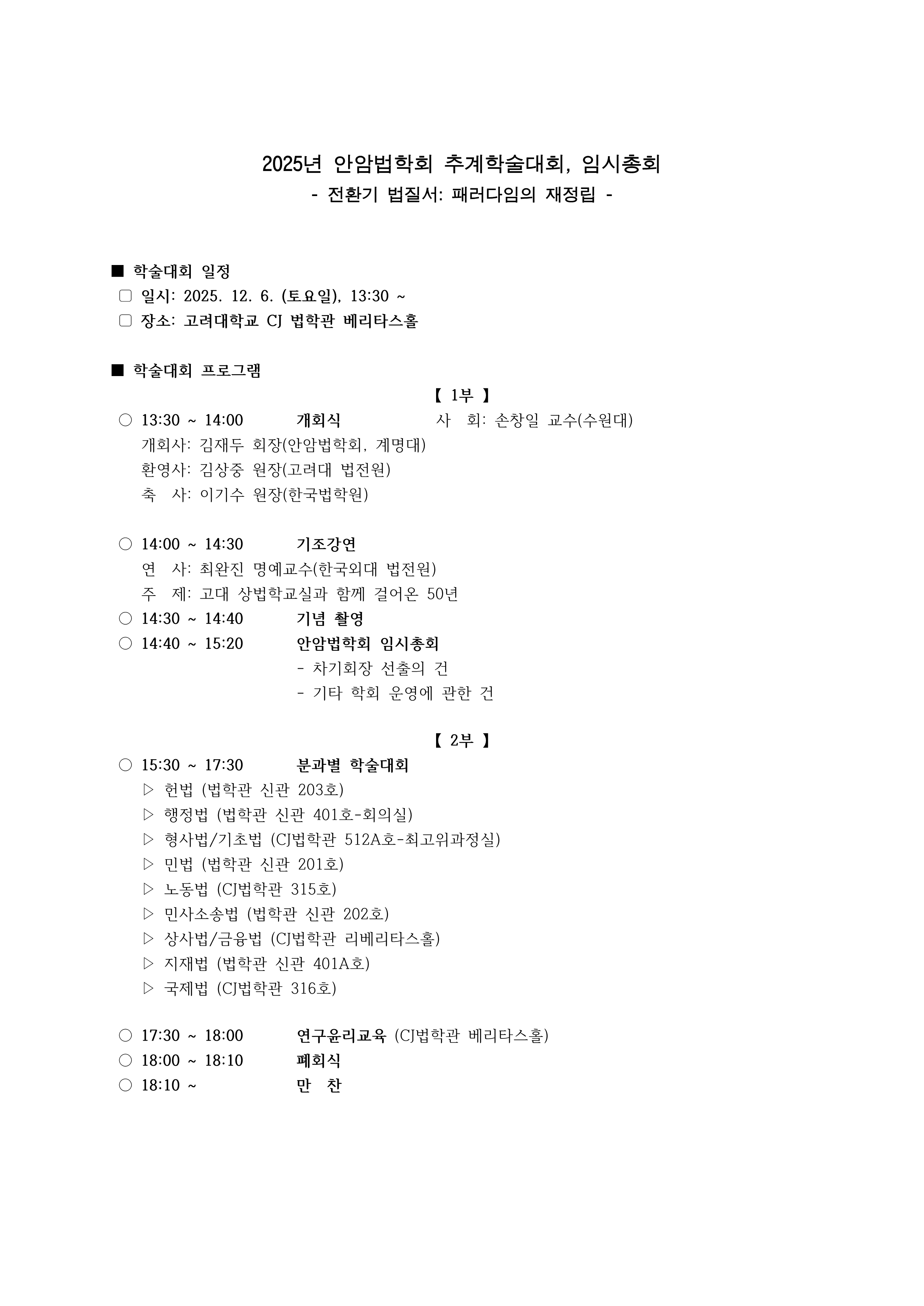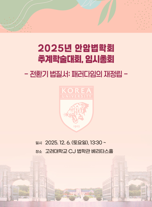 | 제목 | [안암법학회] 2025 추계학술대회 개최 안내(2025.12.06.(토)) |